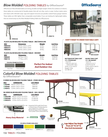 OfficeSource® Blow Molded tables are strong, durable and light weight. Perfect for outdoors or indoors, these tables are constructed of durable plastic that will not chip, crack or warp. Surface resists stains and cleans with mild dish soap. Legs and support structure are powder coated heavy gauge material. These tables are 40% lighter than comparable wood tables. If you are looking for lightweight tables, that are stored away try the Blow Molded Folding Tables by OfficeSource.