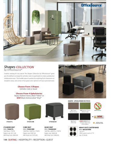 Creative seating for any space! The Shapes Collection by OfficeSource® gives you the ability to arrange the cylinder, cube or quad seats to create a productive collaborative area. This huddle space is perfect for anything from classrooms to reception areas, and comes in four great color options to fit your personal taste.