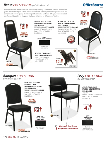 The OfficeSource® Reese Collection offers a high density 2" thick seat cushion, nylon rocker glides and stack bumpers. Chairs are constructed with a baked powder epoxy frame finish and
