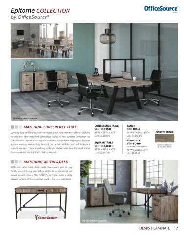 Looking for a conference table to match your new industrial office? Look no further than the matching conference tables in the Epitome Collection by OfficeSource. Choose a rectangular table or a square table to give you the look you are wanting. A matching bench is the perfect addition, and will help your space look great. These matching conference tables also have the sleek metal framework and rusting finish that is on trend.