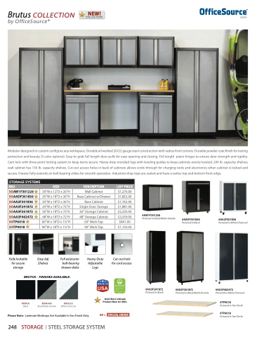 Modular designed to custom configure any workspace. Durable all welded 20/22 gauge steel construction with radius front corners. Durable powder coat finish for lasting protection and beauty (3 color options). Easy-to-grab full length door pulls for easy opening and closing. Full length piano hinges to ensure door strength and rigidity. Cam lock with three point locking system to keep items secure. Heavy-duty rounded legs with leveling guides to keep cabinets evenly leveled. 200 lb. capacity shelves; wall cabinet has 150 lb. capacity shelves. Cut-out access holes in back of cabinets allows cords through for charging tools and electronics when cabinet is locked and secure. Drawer fully extends on ball-bearing slides for smooth operation. Industrial shop tops are sealed and have a radius top and bottom front edge.