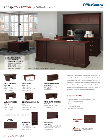 The OfficeSource® Abbey Collection is the epitome of luxury. The collection features a traditional style which blends perfectly with a contemporary office setting. The timeless wood veneer and mahogany finish boasts the idea that it will never go out of style. This collection comes complete with antique brass pulls, which add to the luxurious aesthetics of this office furniture.